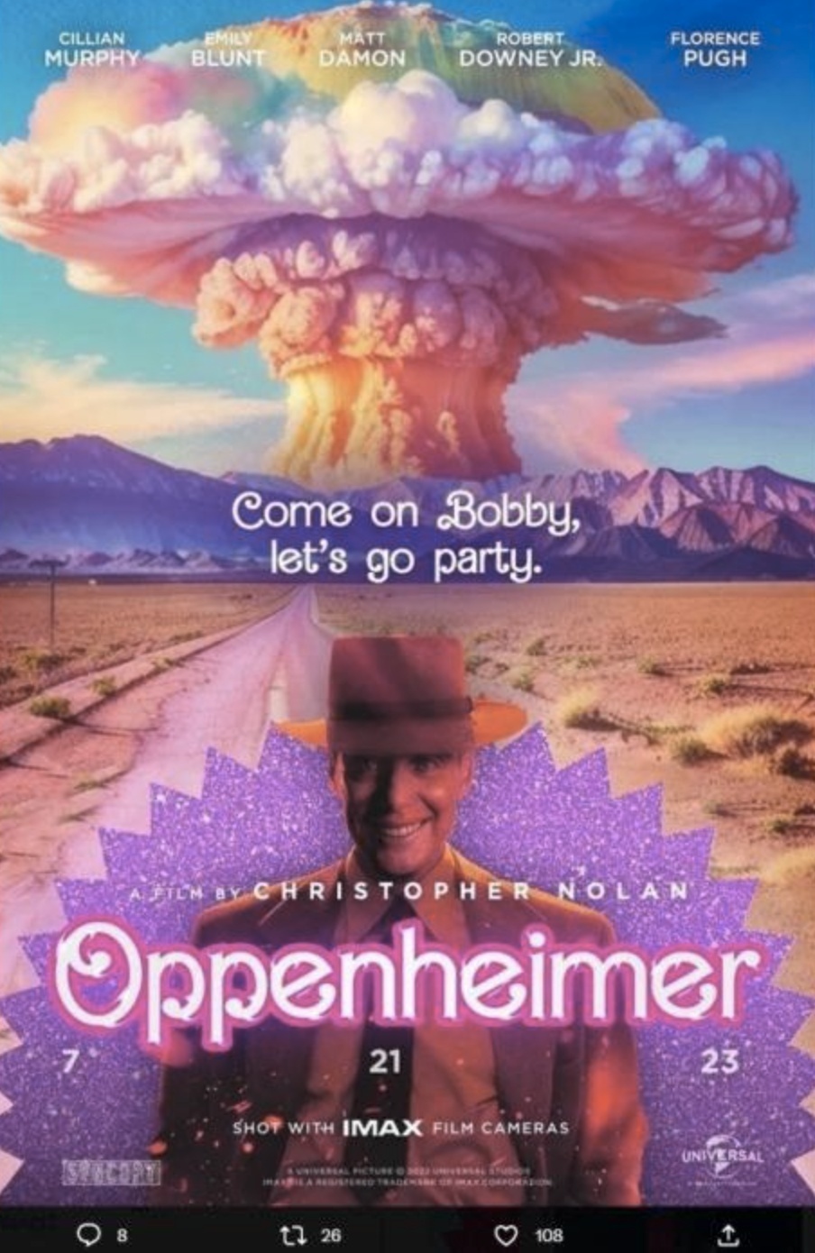 许多影迷将两部影片中主东说念主公的名字“芭比”、“奥本海默”组合起来创造了一个新词——“芭本海默”(Barbenheimer)。此外,他们还在应付媒体上制作各式与#芭本海默#关连的恶搞梗图。